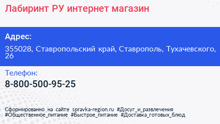 Лабиринт.РУ, интернет-магазин по адресу 355028, Ставропольский край, Ставрополь, Тухачевского, 26 в дальнейшем Организация, размещена в следующих категориях: