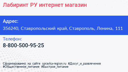 Лабиринт.РУ, интернет-магазин по адресу 356240, Ставропольский край, Ставрополь, Ленина, 111 в дальнейшем Организация, размещена в следующих категориях: