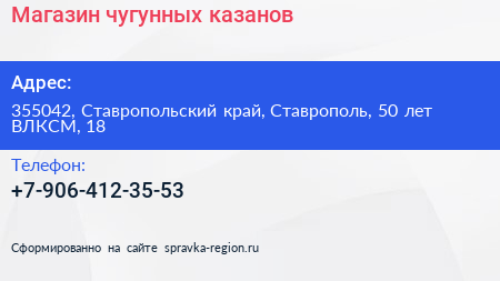 Магазин чугунных казанов по адресу 355042, Ставропольский край, Ставрополь, 50 лет ВЛКСМ, 18 в дальнейшем Организация, размещена в следующих категориях: