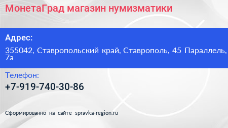 МонетаГрад, магазин нумизматики по адресу 355042, Ставропольский край, Ставрополь, 45 Параллель, 7а в дальнейшем Организация, размещена в следующих категориях: