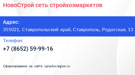 НовоСтрой, сеть стройхозмаркетов по адресу 355021, Ставропольский край, Ставрополь, Родосская, 13 в дальнейшем Организация, размещена в следующих категориях: