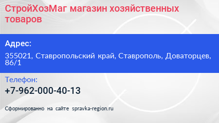 СтройХозМаг, магазин хозяйственных товаров по адресу 355021, Ставропольский край, Ставрополь, Доваторцев, 86/1 в дальнейшем Организация, размещена в следующих категориях: