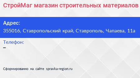 СтройМаг, магазин строительных материалов по адресу 355016, Ставропольский край, Ставрополь, Чапаева, 11а в дальнейшем Организация, размещена в следующих категориях: