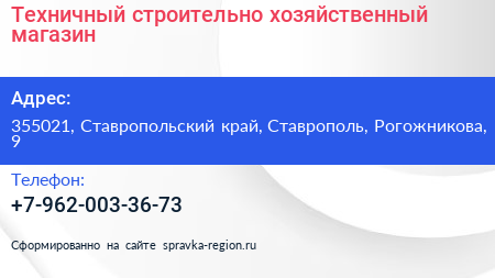 Техничный, строительно-хозяйственный магазин по адресу 355021, Ставропольский край, Ставрополь, Рогожникова, 9 в дальнейшем Организация, размещена в следующих категориях: