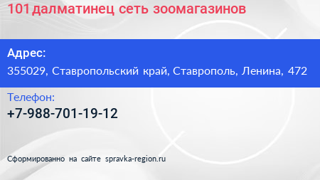 101 далматинец, сеть зоомагазинов по адресу 355029, Ставропольский край, Ставрополь, Ленина, 472 в дальнейшем Организация, размещена в следующих категориях: