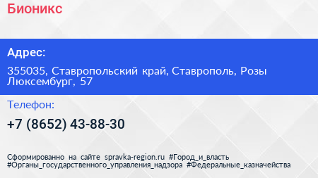 Бионикс по адресу 355035, Ставропольский край, Ставрополь, Розы Люксембург, 57 в дальнейшем Организация, размещена в следующих категориях: