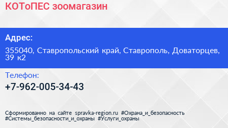 КОТоПЕС, зоомагазин по адресу 355040, Ставропольский край, Ставрополь, Доваторцев, 39 к2 в дальнейшем Организация, размещена в следующих категориях: