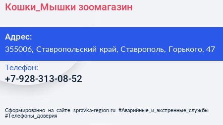 Кошки_Мышки, зоомагазин по адресу 355006, Ставропольский край, Ставрополь, Горького, 47 в дальнейшем Организация, размещена в следующих категориях: