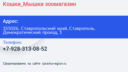 Кошки_Мышки, зоомагазин по адресу 355026, Ставропольский край, Ставрополь, Демократический проезд, 1 в дальнейшем Организация, размещена в следующих категориях: