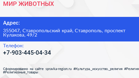 МИР ЖИВОТНЫХ по адресу 355047, Ставропольский край, Ставрополь, проспект Кулакова, 49/2 в дальнейшем Организация, размещена в следующих категориях: