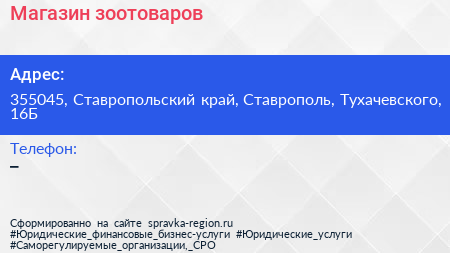Магазин зоотоваров по адресу 355045, Ставропольский край, Ставрополь, Тухачевского, 16Б в дальнейшем Организация, размещена в следующих категориях: