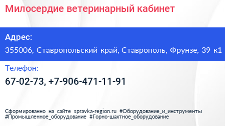 Милосердие, ветеринарный кабинет по адресу 355006, Ставропольский край, Ставрополь, Фрунзе, 39 к1 в дальнейшем Организация, размещена в следующих категориях: