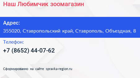 Наш Любимчик, зоомагазин по адресу 355020, Ставропольский край, Ставрополь, Объездная, 8 в дальнейшем Организация, размещена в следующих категориях: