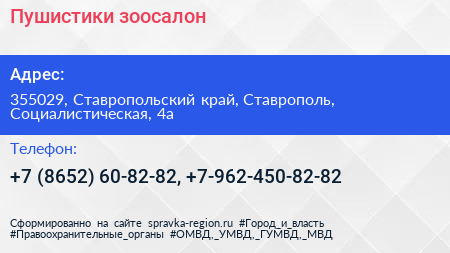 Пушистики, зоосалон по адресу 355029, Ставропольский край, Ставрополь, Социалистическая, 4а в дальнейшем Организация, размещена в следующих категориях: