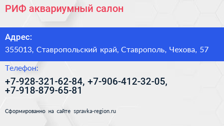 РИФ, аквариумный салон по адресу 355013, Ставропольский край, Ставрополь, Чехова, 57 в дальнейшем Организация, размещена в следующих категориях: