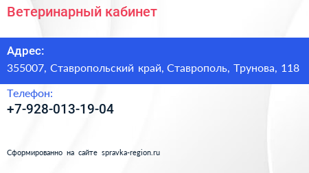 Ветеринарный кабинет по адресу 355007, Ставропольский край, Ставрополь, Трунова, 118 в дальнейшем Организация, размещена в следующих категориях:
