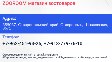 ZOOROOM, магазин зоотоваров по адресу 355037, Ставропольский край, Ставрополь, Шпаковская, 86/1 в дальнейшем Организация, размещена в следующих категориях: