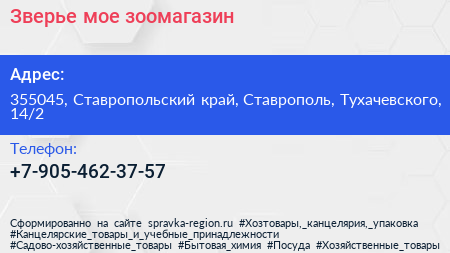 Зверье мое, зоомагазин по адресу 355045, Ставропольский край, Ставрополь, Тухачевского, 14/2 в дальнейшем Организация, размещена в следующих категориях: