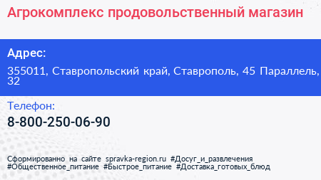 Агрокомплекс, продовольственный магазин по адресу 355011, Ставропольский край, Ставрополь, 45 Параллель, 32 в дальнейшем Организация, размещена в следующих категориях: