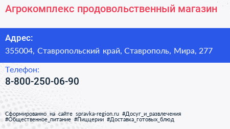 Агрокомплекс, продовольственный магазин по адресу 355004, Ставропольский край, Ставрополь, Мира, 277 в дальнейшем Организация, размещена в следующих категориях: