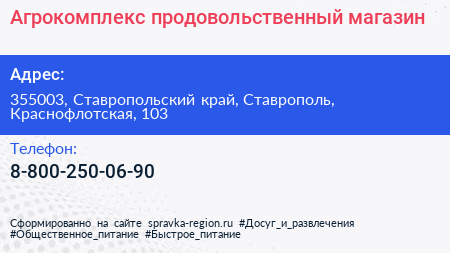 Агрокомплекс, продовольственный магазин по адресу 355003, Ставропольский край, Ставрополь, Краснофлотская, 103 в дальнейшем Организация, размещена в следующих категориях: