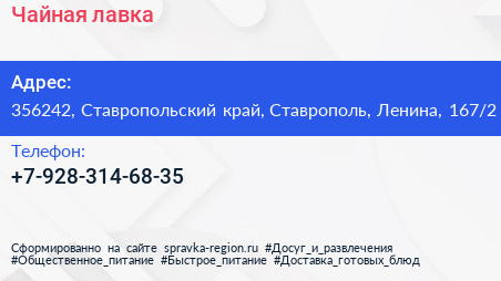 Чайная лавка по адресу 356242, Ставропольский край, Ставрополь, Ленина, 167/2 в дальнейшем Организация, размещена в следующих категориях: