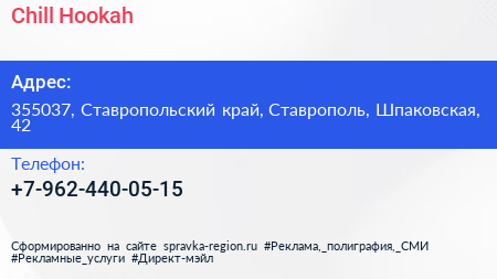 Chill Hookah по адресу 355037, Ставропольский край, Ставрополь, Шпаковская, 42 в дальнейшем Организация, размещена в следующих категориях: