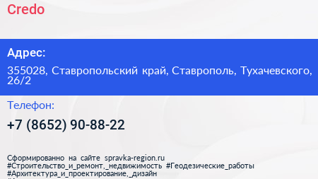 Credo по адресу 355028, Ставропольский край, Ставрополь, Тухачевского, 26/2 в дальнейшем Организация, размещена в следующих категориях:
