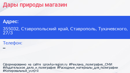 Дары природы, магазин по адресу 355032, Ставропольский край, Ставрополь, Тухачевского, 27/3 в дальнейшем Организация, размещена в следующих категориях: