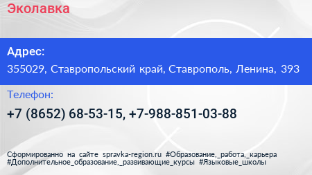 Для связи с организацией воспользуйтесь номером телефона: +7 (8652) 68-53-15, +7-988-851-03-88. Пн: c 10:00-19:00, Вт: c 10:00-19:00, Ср: c 10:00-19:00, Чт: c 10:00-19:00, Пт: c 10:00-18:00, Сб: выходной, Вс: c 10:00-19:00, вы можете обратиться в эту организацию.