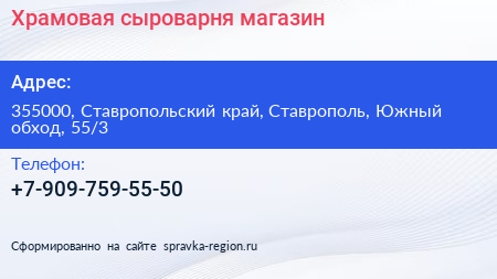 Храмовая сыроварня, магазин по адресу 355000, Ставропольский край, Ставрополь, Южный обход, 55/3 в дальнейшем Организация, размещена в следующих категориях: