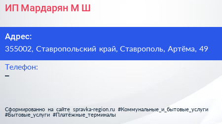 ИП Мардарян М.Ш. по адресу 355002, Ставропольский край, Ставрополь, Артёма, 49 в дальнейшем Организация, размещена в следующих категориях: