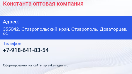 Константа, оптовая компания по адресу 355042, Ставропольский край, Ставрополь, Доваторцев, 61 в дальнейшем Организация, размещена в следующих категориях: