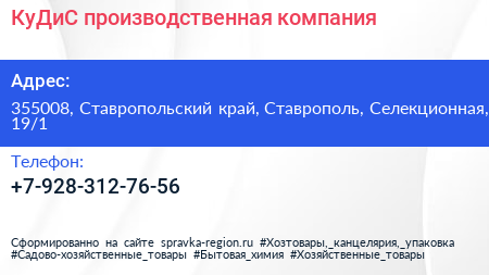 КуДиС, производственная компания по адресу 355008, Ставропольский край, Ставрополь, Селекционная, 19/1 в дальнейшем Организация, размещена в следующих категориях: