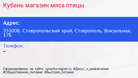 Кубань, магазин мяса птицы по адресу 355008, Ставропольский край, Ставрополь, Вокзальная, 17Б в дальнейшем Организация, размещена в следующих категориях: