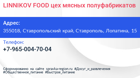LINNIKOV FOOD, цех мясных полуфабрикатов по адресу 355018, Ставропольский край, Ставрополь, Лопатина, 15 в дальнейшем Организация, размещена в следующих категориях: