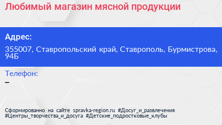 Любимый, магазин мясной продукции по адресу 355007, Ставропольский край, Ставрополь, Бурмистрова, 94Б в дальнейшем Организация, размещена в следующих категориях: