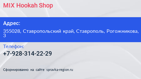 MIX Hookah Shop по адресу 355028, Ставропольский край, Ставрополь, Рогожникова, 3 в дальнейшем Организация, размещена в следующих категориях: