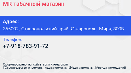 MR, табачный магазин по адресу 355002, Ставропольский край, Ставрополь, Мира, 300Б в дальнейшем Организация, размещена в следующих категориях:
