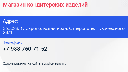 Магазин кондитерских изделий по адресу 355028, Ставропольский край, Ставрополь, Тухачевского, 28/1 в дальнейшем Организация, размещена в следующих категориях: