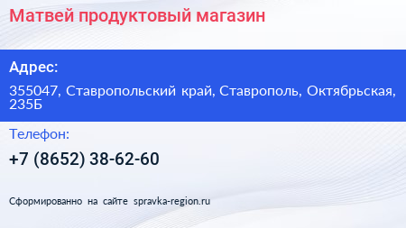 Матвей, продуктовый магазин по адресу 355047, Ставропольский край, Ставрополь, Октябрьская, 235Б в дальнейшем Организация, размещена в следующих категориях: