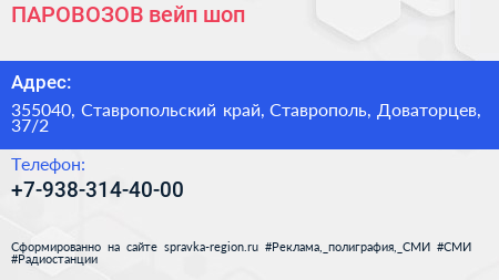 ПАРОВОЗОВ, вейп-шоп по адресу 355040, Ставропольский край, Ставрополь, Доваторцев, 37/2 в дальнейшем Организация, размещена в следующих категориях: