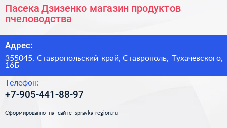 Пасека Дзизенко, магазин продуктов пчеловодства по адресу 355045, Ставропольский край, Ставрополь, Тухачевского, 16Б в дальнейшем Организация, размещена в следующих категориях: