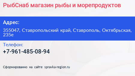 РыбСнаб, магазин рыбы и морепродуктов по адресу 355047, Ставропольский край, Ставрополь, Октябрьская, 235е в дальнейшем Организация, размещена в следующих категориях: