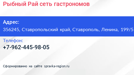Рыбный Рай, сеть гастрономов по адресу 356245, Ставропольский край, Ставрополь, Ленина, 199/5 в дальнейшем Организация, размещена в следующих категориях: