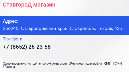 СтавгороД, магазин по адресу 356245, Ставропольский край, Ставрополь, Гоголя, 42а в дальнейшем Организация, размещена в следующих категориях:
