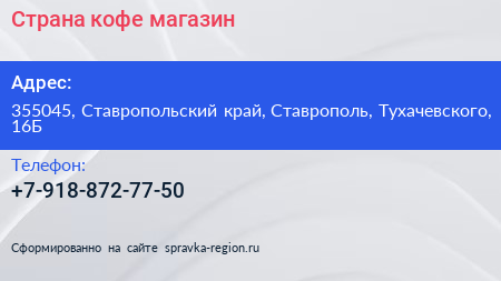 Страна кофе, магазин по адресу 355045, Ставропольский край, Ставрополь, Тухачевского, 16Б в дальнейшем Организация, размещена в следующих категориях: