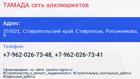 ТАМАДА, сеть алкомаркетов по адресу 355021, Ставропольский край, Ставрополь, Рогожникова, 9 в дальнейшем Организация, размещена в следующих категориях:
