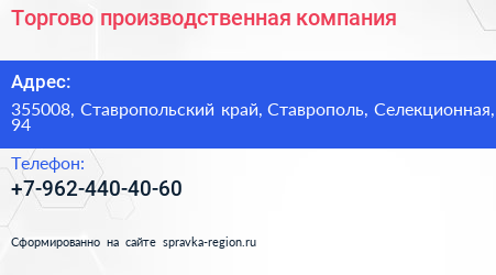 Торгово-производственная компания по адресу 355008, Ставропольский край, Ставрополь, Селекционная, 94 в дальнейшем Организация, размещена в следующих категориях: