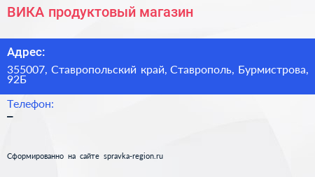 ВИКА, продуктовый магазин по адресу 355007, Ставропольский край, Ставрополь, Бурмистрова, 92Б в дальнейшем Организация, размещена в следующих категориях: